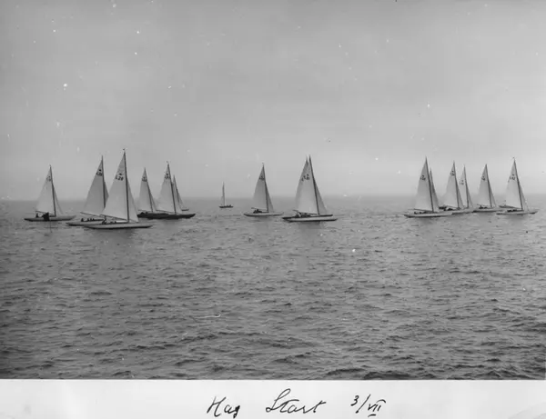 Övrigt: Att denna segling fotograferats 3 juli torde framgå av anteckningen på framsidans n kant, men vilket år eller i vilket sammanhang den ägt rum är inte känt. En fingervisning härvidlag utgörs av att den yngsta hajbåten på bilden var byggd 1938. Båtarna är fr v t h L10 HAILI (b. 1931), L26 LI (b. 1934), L28 LI-LI (b. 1934; ex ALLI), L63 PEGGY (b. 1938), L57 SWAJ (b. 1937; ex SIRU), L59 DREAM (b. 1937), L21 SQUALE (b. 1934), L32 JOHANNA (b. 1935), L36 FIA (b. 1935), L35 INGER (b. 1935), L58 HILDUR (b. 1937) och L42 ELISABET (b. 1936). Källa Finlands Båtkalender 1939.