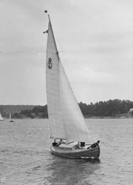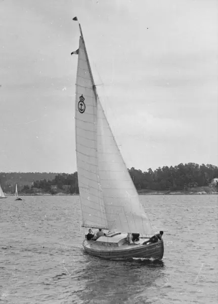 Övrigt: En av Sjövärnskårens kostrar; tid och sammanhang okända. Åtminstone under 1942-44 deltog Sjövärnskåren i KSSS poängseglingar i Saltsjöbaden; att bilden härstammar från någon av dessa seglingar är tänkbart men inte belagt. Jfr referatet i Till Rors årg. 8 (1942) nr 8 s 256 ff från KSSS poängseglingar hösten 1942; där omtalas Sjövärnskårens nybyggda Reimers-kostrar. Kopian är gjord från samma neg som KSSS-samlingens Fo134472.
