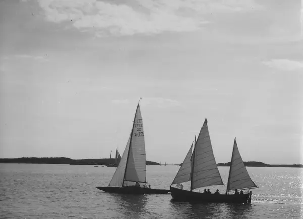 Övrigt: Från Sandhamnsregattan 1943, 31 juli. T h om 22-S177 LILL-STINA ses en av marinens loggertriggade livbåtar, som deltog i seglingarna detta år. LILL-STINA ursprungligen lottbåt i Ekolns Segel Klubb, byggd till Stockholmsutställningen 1930. Kopian finns även i Cornebys samling, samma Fo-nr.