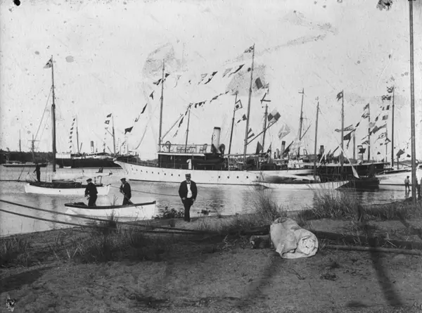 Övrigt: Från konung Oscar II:s Jubileumsregatta 1897. Mannen som går i land från livbåten är KSSS sekreterare Richard Öhnell. Dessa uppgifter återfanns i bildtexten då fotografiet återgavs i KSSS årsbok 1947 s 171. Bakom bankir Burmans ånglustjakt VALKYRIAN ses Sveabolagets passagerarångare BORE (b. 1853). Fotografiet återfinns i KSSS-samlingen även som Fo110216AB, som är i bättre skick. Att märka är att Klemming uppenbarligen åstadkommit dessa kopior vid skilda tidpunkter, eftersom adressangivelserna på monteringsbasen skiljer sig åt (Drottninggatan 88 - Hamngatan 38).