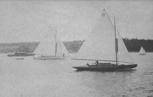 Övrigt: Denna bild är tagen under de internationella kappseglingar KSSS i juli 1912 arrangerade i anknytning till OS-seglingarna utanför Nynäshamn. Se även Fo134726 och Fo102604A samt fotografiet bland försättsplanscherna i KSSS årsbok 1913, där BOHÈME bär samma segelnummer. Segeljakten bakom BOHÈME har inte kunnat identifieras. Längst bort t v ses bogserbåten ODEN (b. 1872 på Bergsunds MV). Fotografiet återfinns även som vykort från de Olympiska spelen i Stockholm 1912 i C. G. Jacksons samling (44/337).