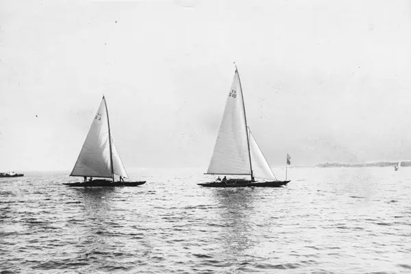 Övrigt: Från KSSS Pingstregatta (Kanholmsregattan) 1924. 55-S10 VIVIAN ursprungligen Sveriges Författarförenings lottbåt 1916, därefter ZIGANKA; senare ZULAMIT, NERIDA. Båten t v är 55-S3 TANJA (b. 1923, konstr. Gustaf Estlander). Markeringar och anteckningar på kopians baksida tyder på att denna bild varit tänkt att återges i tryck; var så skett är dock inte bekant.