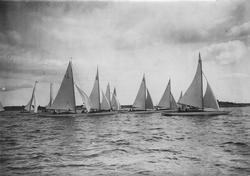 Övrigt: Från Sandhamnsregattan 1920, 40 kvm skärgårdskryssarnas start på Kanholmsfjärden söndagen 8 augusti. Båt nummer tre fr v är 40-S20 GIL II (b. 1919, konstr. Erik Salander); ...