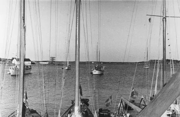Övrigt: Från KSSS s k sjötåg till Finland 1936; Hangö, där denna bild togs 7 juli, var ett av etappmålen på väg till Helsingfors och Nyländska Jaktklubbens 75-årsjubileum. Den enda båt som kan identifieras är den halvt skymda motorjakten t v, som är Erik Åkerlunds STELLA MARINA (b. 1927, konstr. C. G. Pettersson); denna båt var chefsfartyg under sjötåget. Om eskaderseglingen, se KSSS årsbok 1937 s 128 ff och Till Rors årg. II (1936) nr 6 s 8 ff.