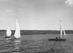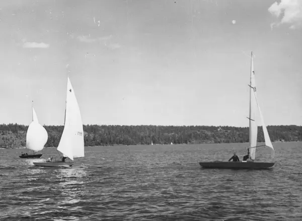 Övrigt: Från KSSS poängseglingar våren 1943, starbåtar på Baggensfjärden 30 maj. 1799 PETITA andra båt fr v; båten längst t v har inte kunnat identifieras; båten t h är enligt seglingsprotokollet antingen 1802 UNN (b. 1939) eller 1804 BRIDGE II (b. 1939); endast siffrorna 1 och 8 kan urskiljas i segelnumret. Jfr Fo145029, där PETITA och UNN ses efter målgången.