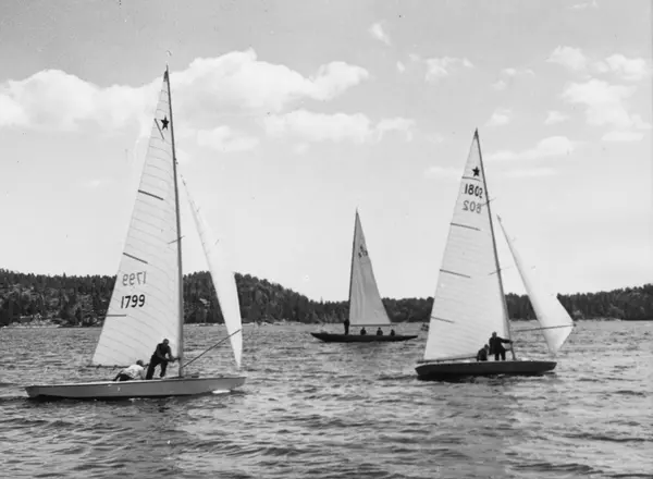 Övrigt: Från KSSS poängseglingar våren 1943, starbåtar på Baggensfjärden 30 maj. 1799 PETITA t v, t h 1802 UNN (b. 1939) och i mitten 6m-jakten 6-S13 MARIANNE (b. 1934, konstr. Tore Holm). Anteckningen på kopians baksida syftar på att Alban Verne med 1802 UNN 30 maj vann den andra seglingen för starbåtar under poängseglingarna 1943.