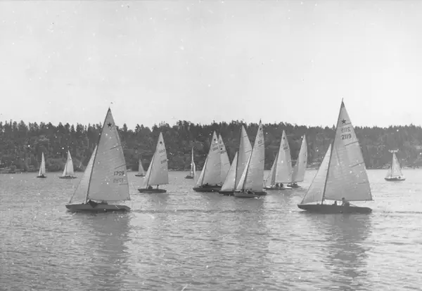 Övrigt: Från KSSS poängseglingar våren 1943, starbåtar på Baggensfjärden 30 maj. 2119 SIBYLLA II i förgrunden t h; t v ses 1799 PETITA (b. 1939); mellan PETITA och SIBYLLA kan urskiljas fr v t h 2126 GUN (b. 1942), 1802 UNN (skymd; b. 1939), 1804 BRIDGE II (skymd; b. 1939), oidentifierad båt, 1113 INGRID (b. 1935), 860 ASTRA (skymd; b. 1931) och 863 BLUE BIRD (skymd; b. 1932).