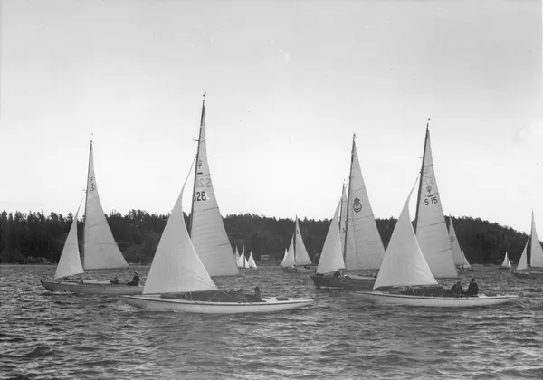 Övrigt: Att denna bild tagits under KSSS poängseglingar på Baggensfjärden i september 1943 framgår av närvaron av Sjövärnskårens kostrar i bakgrunden (Sjövärnskåren deltog även i Sandhamnsgatan 1943, men då var inte folkbåten F-S51 KRYSS [b. 1942, konstr. Tord Sundén] längst t v med). Neptunkryssare S28 HELENE ses närmast kameran i v bildfält; bakom ses en annan neptunkryssare, S15 GULLAN VII (b. 1941). Jfr alternativexponering Fo145038.