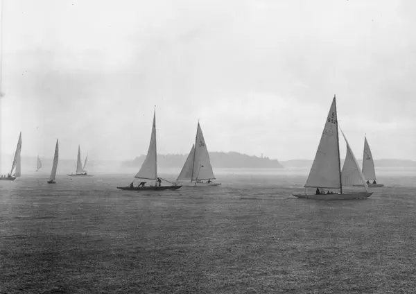 Övrigt: Vilken segling bilden visar är osäkert; enligt KSSS segelprotokoll ägde ingen segling rum i sällskapets regi den 19 juli 1943, det datum Norberg stämplat på kopians baksida. Däremot hölls Juniregattan mellan Vaxholm och Sandhamn och på Kanholmen den 19 och 20 juni, och referatet talar om skyfall och hagel (jfr baksidesanteckningen och KSSS årsbok 1944 s 102 ff); möjligen har Norberg justerat sin datumstämpel fel. 6-S52 SINKADUS är båten närmast kameran längst t h; skymd bakom SINKADUS ses 5-S35 GULLMAR (b. 1939, konstr. Arvid Laurin); båda dessa båtar ägdes av Harry Nyström. Med ljust skrov i mitten ses 6-S47 NINNIE (b. 1940, konstr. Harry Becker); övriga båtar har inte kunnat identifieras.