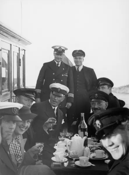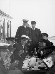 Övrigt: Oidentifierade KSSS-medlemmar jämte två oidentifierade damer intar kaffe med avec uppe vid styrhytten ombord på SANDHAMNS EXPRESS. Andra bilder i KSSS-samlingen från samma tillfälle Fo54830A samt Fo145472, -474 och -481. Enligt anteckning på Fo54830A ska en av personerna på bilden, av mössmärkena att döma mannen t v längst bak, vara kapten Bredenberg på SANDHAMNS EXPRESS. Fotograferingstillfället låter sig inte bestämmas; kapten Bredenberg avled dock sommaren 1941 (KSSS årsbok 1942 s 107). Sandhamns Express döptes 1949 om till NORRSKÄR.
