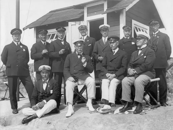 Övrigt: Seglingsnämnden under Sandhamnsregattan 1926, tisdagen 3 augusti vid Skanskobben. Den G. Andersson som ses stående längst t v torde vara Gunnar Andersson, styrelseledamot i KSSS 1925-26; detta har dock inte kunnat bekräftas. Mannen som sitter längst t h bär KSSS emblem i mössan och ska enligt baksidesanteckningarna heta K. A. Nyberg; någon sådan person återfinns dock inte i sällskapets medlemsmatriklar, och mannens identitet är därmed oviss. De båda herrarna på stolar i mitten av främsta ledet ska enligt baksidesanteckningarna heta Weidenholtz och Weitzmann; några personer med dessa namn fanns dock inte i KSSS vid mitten av 20-talet. Eftersom Sandhamnsregattan detta år omfattade seglare från flera länder är det tänkbart att herrarna var utländska gäster. Baksidesanteckningarna antyder att detta fotografi återgivits i tryck; var så skett är dock inte bekant.