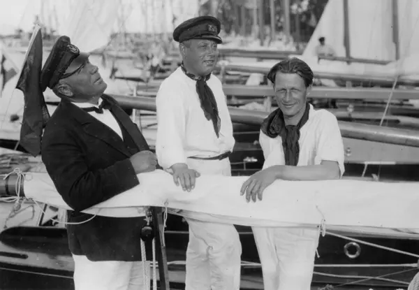 Övrigt: Josef Edlund t v ombord på sin SK30 30-S112 TVÅ SANG tillsammans med Pelle Bjurström i mitten och Nils Jeppsson t h. I vilket sammanhang bilden tagits är ovisst; Edlund uppges vara ägare till TVÅ SANG fram till 1936. Jfr Fo92777A i KSSS-samlingen från samma tillfälle.