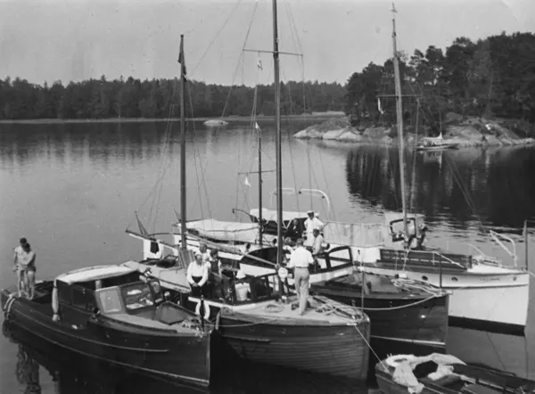 Övrigt: Från KMK:s och KSSS dagdistanstävling 15 augusti 1936 (om dagdistanstävlingen och den nattliga tävling som föregått den, se KMK:s årsbok 1937 s 36 ff och KSSS årsbok 1937 s 113 ff); lunchpaus i Paradiset (Djupfladen) nära Finnhamn. Fotografiet återgivet i KSSS årsbok 1937 s 120. GITTAN II är båten t v närmast kameran. Den Köhler som omtalas i anteckningarna torde vara Lars Köhler, medlem av KSSS och ägare till motorjakten EL KOBE.