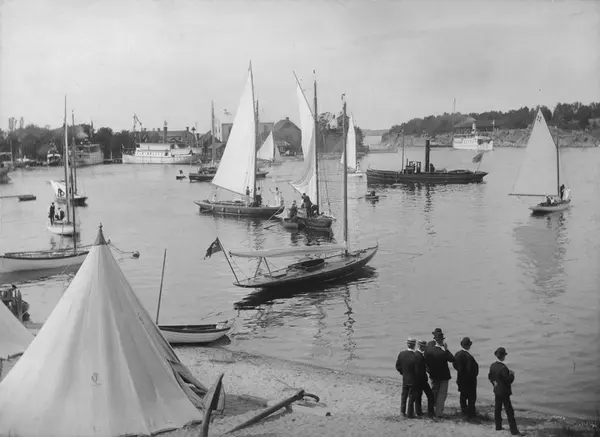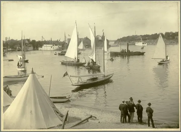 Övrigt: Sandhamn, osäkert när. I Bergengren: Skärgårdsbåt till sommarnöjet (Sthlm 1965) påstås att segeljakten med mörkt skrov i förgrunden är John Carlssons ("Glas-Kalle") VIKINGE...