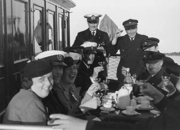 Övrigt: Oidentifierade KSSS-medlemmar jämte två oidentifierade damer intar kaffe med avec uppe vid styrhytten ombord på SANDHAMNS EXPRESS. Andra bilder i KSSS-samlingen från samma tillfälle Fo54830A samt Fo145472, -474, -481 och -482. Av mössmärkena att döma torde mannen t v längst bak vara kapten Bredenberg; de övriga herrarna har KSSS-mössor. Fotograferingstillfället låter sig inte bestämmas; kapten Bredenberg avled dock sommaren 1941 (KSSS årsbok 1942 s 107). Sandhamns Express döptes 1949 om till NORRSKÄR. Repro av detta foto med samma Fo-nr finns.
