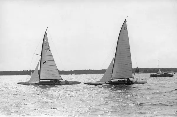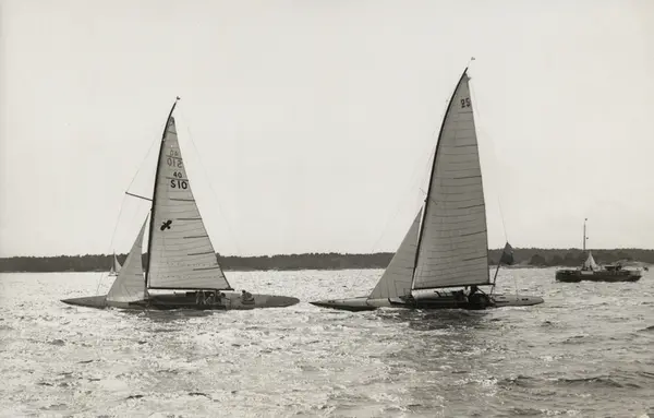 Övrigt: Från Sandhamnsregattan 1925, bankappsegling på Kanholmsfjärden 3 augusti. Båten t v är Ejnar Aarsleffs 40-S10 RIVAL (b. 1925, konstr. Yngve Holm). BOJA t h med temporärt segelnummer 25 bar från 1935 permanentnummer 40-S4; skrotad 1951. Fotografiet återgivet i KSSS årsbok 1926 s 167. En sämre reprokopia återfinns i Bertil Norbergs samling, även denna som Fo92563A.