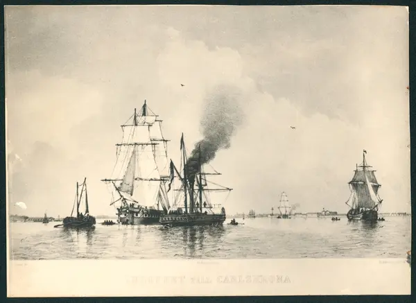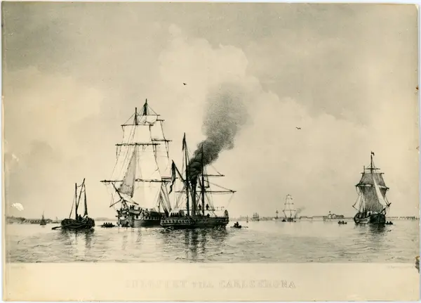 Reprofotografi efter en litografi som visar korvettens Carlskronas inlopp till Karlskrona. Bilden återge en panoramavy över Karlskronas hamn med livlig skeppstrafik. Runt korvetten kör flera mindre segelskepp och roddbåtar. I föregrund finns en hjulångare med riggning. I bakgrunden syns befästningsanläggningar.