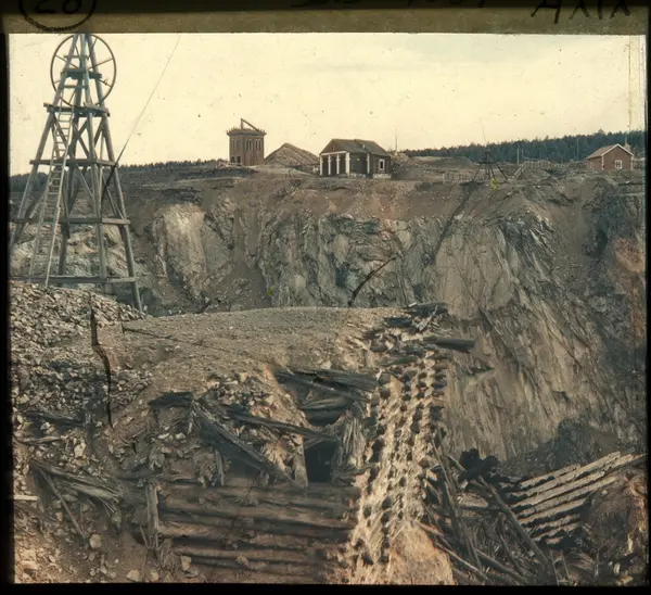 Skioptikonbild från institutionen för fotografi vid Kungliga Tekniska Högskolan. Använd av professor Helmer Bäckström som föreläsningsmaterial. Bäckström var Sveriges första professor i fotografi vid Kungliga Tekniska Högskolan 1948-58. Motiv föreställande "Dagbrott, gruva", Stora stöten vid Falu koppargruva, Dalarna.