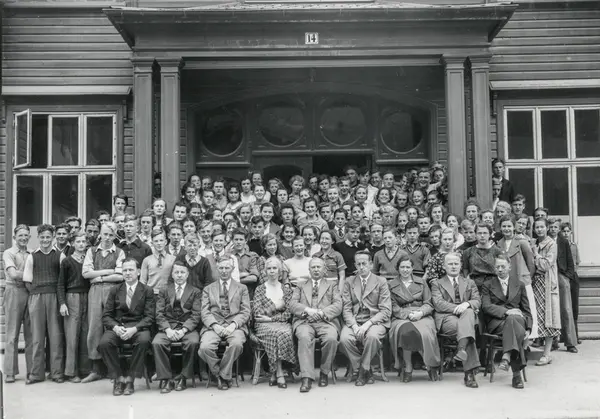 Biletet er teke foran hovudinngangen på Hotel Hardanger, som mellom anna vart nytta til undervisning desse åra.1., 2. og 3. klasse ved middelskulen og lærarane. Foran frå v.: Lærarane Håvald C. Håvaldsen eller Einar Lønning?, Anders Reisæter, Olav Holm, Astrid Helene Bodal, Martin Svendsen (skulestyrar), Finn Brown, Dikken Monclair, Johannes A. Lohne, Einar Austlid.