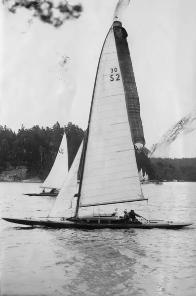 Övrigt: Det är ovisst när denna bild tagits. Båten ursprungligen lottbått SSB 1923, SS Brunnsviken, byggd efter 1920 års regel. H. Saxin uppges i SSF:s lista över permanenta segelnummer som ägare till båten 1924. Enligt Thelander: Alla Våra Skärgårdskryssare (Sthlm 1990) s 74 har båten senare sålts till Irland. I bakgrunden skymtar 1922 års lottbåt i SSB, 30-S44 SOLBRITT, senare HORTENCE (b. 1922, konstr. Tore Holm).