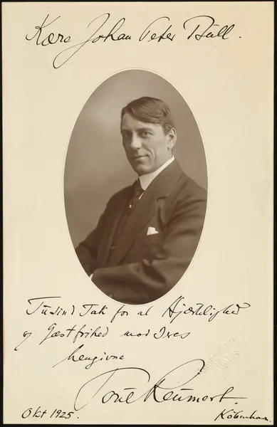 - Påskrift: "Kære Johan Peter Bull. Tusind Tak for al Hjærtelighed og Gæstfrihed mod jeres hengivne Poul Reumert. Köbenhavn Okt. 1925"