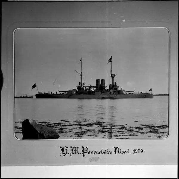 Fartygsporträtt som visar pansarbåten Niord till ankars. Fartyget syns från babordssidan där en skeppsbåt ligger förtöjt. Flera repstege leder upp till däcket. Vid akterskeppet ligger ett mindre ångfartyg som verka håller på att försörja pansarbåten. På förskeppet arbetar två men. I bakgrunden syns kusten. Förgrunden domineras av en stor stenblock och man anar strandkanten på grund av tång i vattnet.