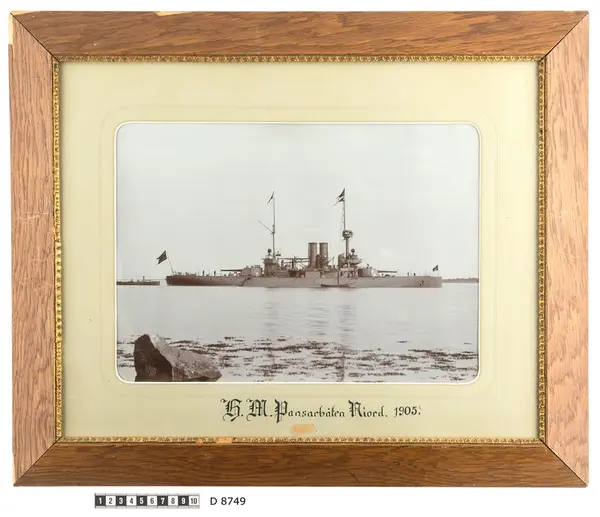 Subject Fartygsporträtt som visar pansarbåten Niord till ankars. Fartyget syns från babordssidan där en skeppsbåt ligger förtöjt. Flera repstege leder upp till däcket. Vid akterskeppet ligger ett mindre ångfartyg som verka håller på att försörja pansarbåten. På förskeppet arbetar två men. I bakgrunden syns kusten. Förgrunden domineras av en stor stenblock och man anar strandkanten på grund av tång i vattnet.