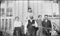 - Gården Langmo (Rønningen) er sjøleierbruk fra 1790-åra. Fra v: Karoline Langmo, Kristoffer Langmo med langpipe, Klara og Andreas Schjetne. Kristoffer er faren til Karoline og Klara. Usikker på hvem mannen bakerst er.