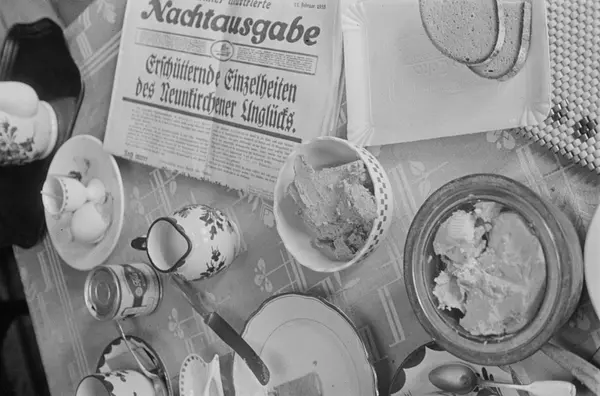 - PhotographMotiv: Tyskland: Ett dukat frukostbord med en tidning "Nachtausgabe". Motiv: Tyskland, Berlin... (NMA.0082441-04)