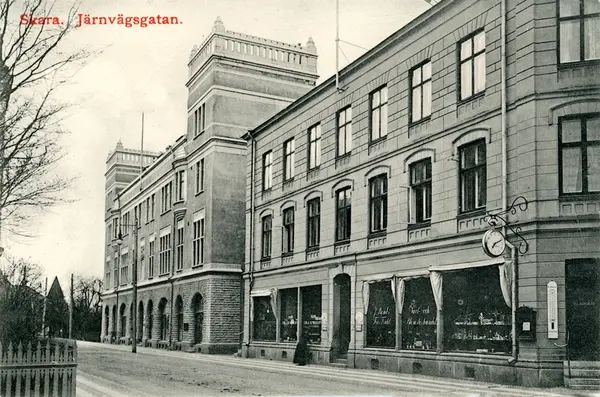 På vykortet ses Järnvägsgatan 12 o 14 från läroverksgården.