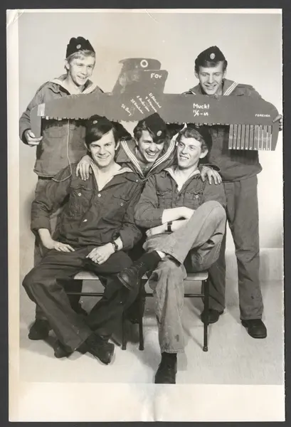 Grupporträtt som visar fem värnpliktiga från ubåten Forellen inför sin utryckning. Två av dem håller en pappmodell av ubåten upp som har på sin underkant pappremsor som blev avklipp under nedräkningen. Den bär påskriften "Muck 11/4-69" och namne av de fem kamrater Söderling, Johansson, Andersson, Bonholm och Berg. Mannen längst ner till vänster är givaren Lars Söderlind som tjänstgjorde som kock på ubåten. Sin kamrat högst upp till vänster är Kjell Johansson. Alla fem skrattar och verkar ser med glädje framåt på sin utryckning.