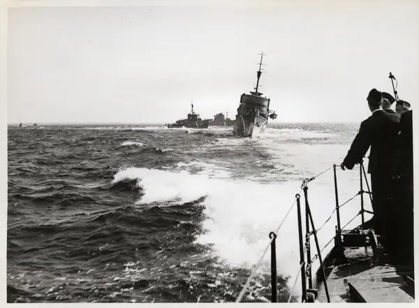 Bilden är tagen från däck på ett örlogsfartyg av vilket man ser en del av relingen till höger i förgrunden. Här står fyra besättningsmän som spanar ut mot jagaren HMS Nordenskjöld som framförs kölvattet av det första fartyget. I bakgrunden ses minsveparen HMS Holmön och Hjälpkryssaren nr 14 Wiros. Dessa tre fartyg har lodräta, vita neuatralitetsband åt fören till.