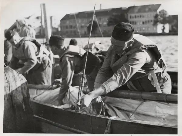 På bilden ses tre unga män täcka över en båt efter segling. Fokus i bilden ligger på den man som befinner sig i förgrunden till höger. Utöver sin uniform bär han en flytväst, likso...