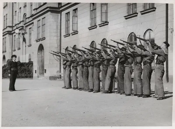 På bilden syns unga män öva med gevär. De är fjorton till antalet och befinner sig till höger i bild, upprade från förgrund till mellangrund. Alla siktar med sina gevär snett uppåt vänster. Samtliga är klädda i uniform komplett med mössa, bussarong med sjömanskrage, byxor och skor .