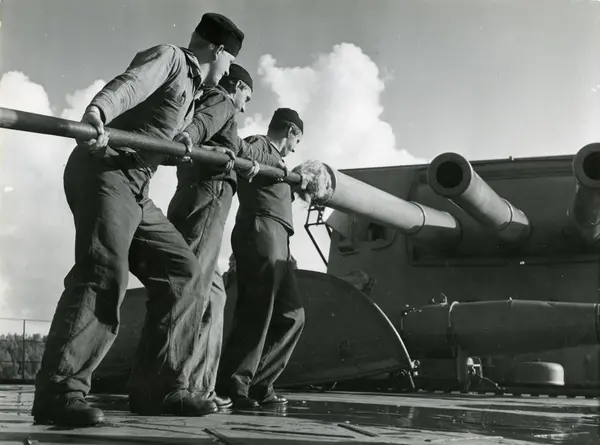 - PhotographPansarskeppen GUSTAF V, DROTTNING VICTORIA och SVERIGE löper ut. (Fo62439A)