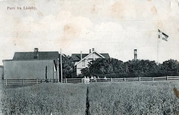Postkort med motiv fra Lisleby, landhandel, og bakeri, ca. 1905-10 mot Selbak fergested. Aasta Gjøby arbeidet der. Bygningen brant engang før 1920.