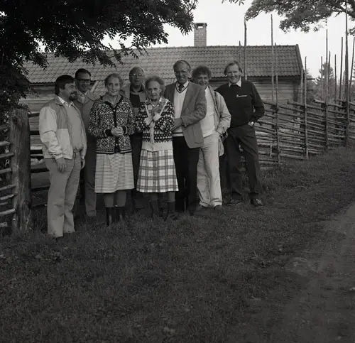 Bilden är tagen med självutlösare av Hilding vid Bergmans fäbodstuga på Harsen i Järvsö, personerna står i fägatan utanför stängslet, stugan i bakgrunden. Personer fv. Mats Fack ordförande Järvsö Hembygdsförening, Kan ej identifieras, Kristina Persson kallas Stina ägare till vallen, Lars Holger Röstlund sekreterare i Hälsingekretsen, Ingeborg Persson ägare till vallen, Börje Björklund ordförande i Hälsingekretsen, Lennart Färlin kretsens styrelse, Hilding Mickelsson kretsens styrelse.