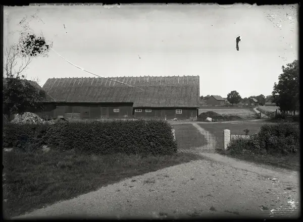 Här är den gamla ladugården i Skattebacken Kroken. Den byggdes 1870, av halvbröderna Anders och Nils Andersson, då flyttade man ut, Anders till Kroken och Nils till Krusegården. De flyttade från huvudgården Skattebacken vid kyrkan, detta efter laga skifte som skedde sent för dessa gårdar. Krusegården där Nils bodde syns i bakgrunden. Nils var sångare och sjöng i kyrkokören. Nils son Johannes Nilsson tog sedan över gården. Före de flyttar hit på ägor som de redan ägde, så bodde här en torpare som också var skomakare. Rester av skomakarverktyg hittade Enar som bodde kvar på hemgården. Gustaf Andersson fotografen hade en syster Anna som gifte sig med Andreas Bergman och bodde på Krusegården uppe vid kyrkan. Anna och Andreas dotter Valborg är det som berättar det mesta om alla fotona. Bl a berättar hon om sin mormor och morfar Anders och Anna Andersson att morfar tyckte mycket om vasslen efter de tjärnat smör. Många gånger gick Valborg genom grinden här, med flaskor fyllda med vassle. Morfar Anders var en mycket aktad man i bygden. Han var också bra sångare och sjöng i kyrkokören. En gång kom prästen på besök. till gården. Han hade hört att Anders var sjuk så han kom på sjukbeök. Hustru Anna sade då att så farligt sjuk är han nog inte för han går där ute på gärdet och plöjer.