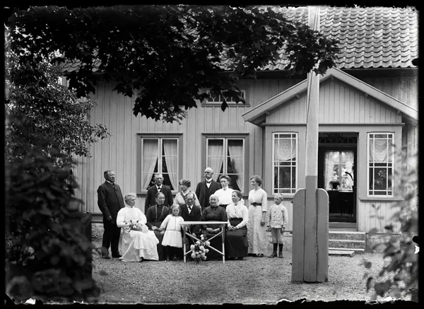 Valborg Bergman: Nej jag vet inte var hela gruppen kommer ifrån, men där är samma flickan som fanns på andra kort, samt båda dessa damer, från vänster stående Nr 3 och Nr 6 finns på annat foto. Den lilla flickan i ljus klänning kände Valborg igen att det är Anna i Änga. Troligen är fotot taget i Änga. Vaborg och Anna var lika gamla. Det finns också ett foto på enbart detta hus.
