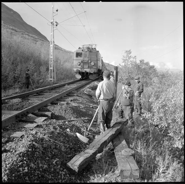 Närmast med ryggen mot kameran står banarbetarna Nils Nutti, till höger om honom Lars Pååve. Allra längst ut till höger och bortom Johan Sunna