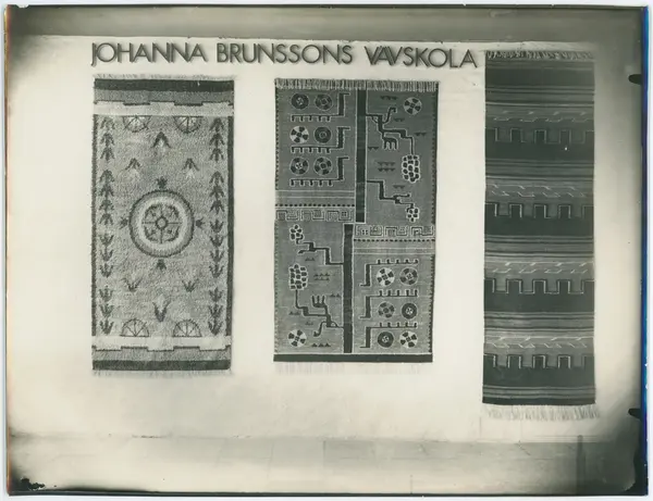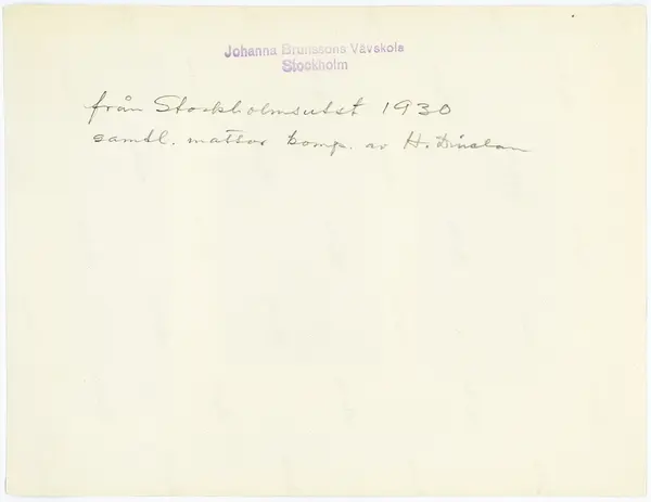 Text på baksidan av bild: "Johanna Brunssons vävskola Stockholm. Från Stockholmsutst. 1930. Samtliga mattor komp. av H Dinclau"
