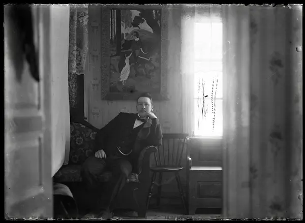Detta är fotografen Gustaf Andersson i Kroken Skattebacken. Gustaf hade mörkrum för fotograferingen, ovanför potatiskällaren som ännu finns kvar. Den ligger bredvid mangårdsbyggnaden. På våren växte där så vackra gullvivor i gult och mörkrött, sådant ser man inte längre nu. Gustav gick i fotograf Karin Erikssons lära, hon var fotograf i Nossebro. Sedan köpte Gustav egen kamera, det var en ateljé kamera med stort utdrag, och fotografen kröp under ett svart skynke. Kameran såldes sedan, vilket jag tycker det var synd att det blev så, bara ett par linser finns kvar.