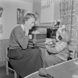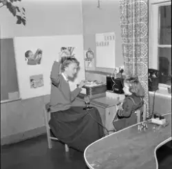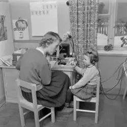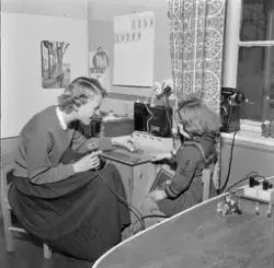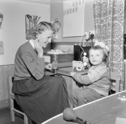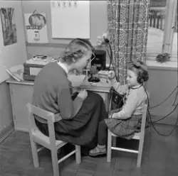 Bildetekst: "Lille Janna på 2,5 år er døv, men reagerer likevel på forsterkede lyder. Telefonringingen er tatt opp på lydbånd, og når hun oppfatter lyden gjennom høretelefonene, løfter hun straks av røret på leketelefonen som lærerinnen, Ellen Jacobsen, har anbragt foran henne".