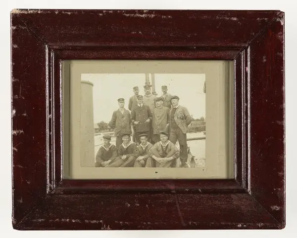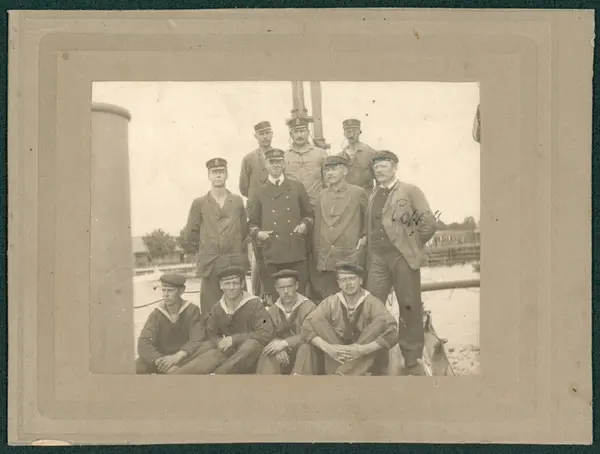 Subject Bilden visar besättningen av ubåten U 2 som har samlats på däck för fotografering. Personer på bilden är: Chef löjtnant Koriander, uppb.styrm.2:gr J.W.Svensson, uppb.maskt.2:gr A.E.Lindohf (på bilden markerad "pappa', torp.uppb.m UOK 'F.O.Olsson, 1:e styrm. UOK Karlsson och 1:e maskt. UOK Andersson.
