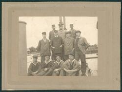 Bilden visar besättningen av ubåten U 2 som har samlats på däck för fotografering. Personer på bilden är: Chef löjtnant Koriander, uppb.styrm.2:gr J.W.Svensson, uppb.maskt.2:gr A.E...