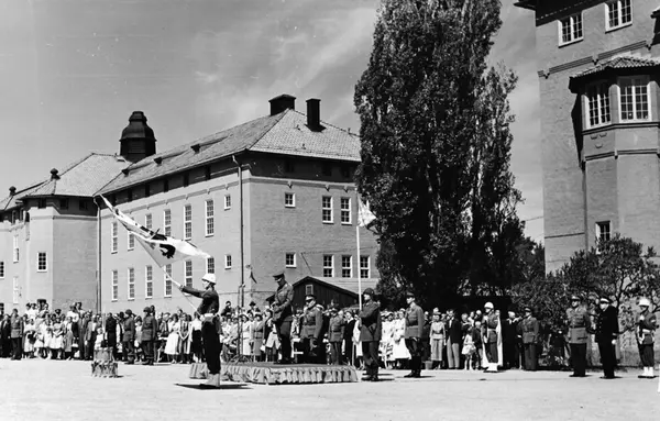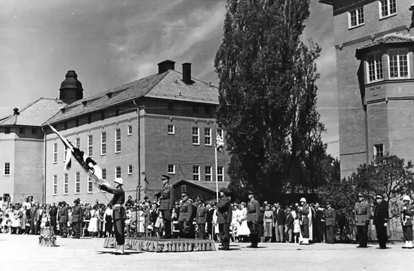 1850 års fana hade nu tjänat ut och kung Gustav VI Adolf övelämnar den nya fanan med alla regementets segernamn till regementschefen. Denna fana förde Södermanlands regemente till nästa byte 1994.