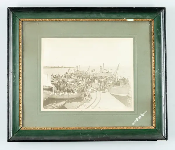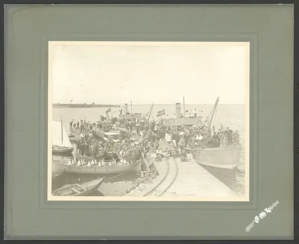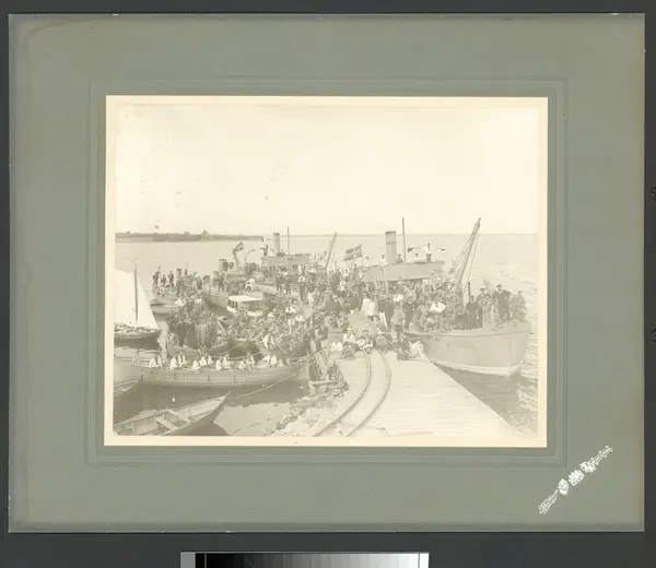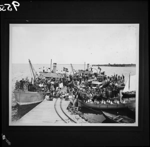 Subject Bilden visar bryggan vid Drottningskärs kastell där flottans personal håller på att lasta minor på en minutläggare. I förgrunden ser man rälsen på bryggan för transport av minor. Runt omkring bryggan pågår en livlig trafik med mindre ångfartyg och segelbåtar. Sceneriet är tydligen arrangerat då alla personer på bryggan och på fartygen står stilla och vänder sig mot fotografen.