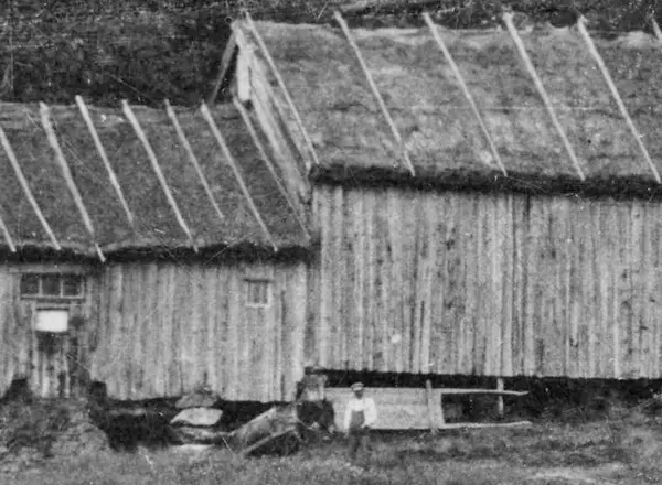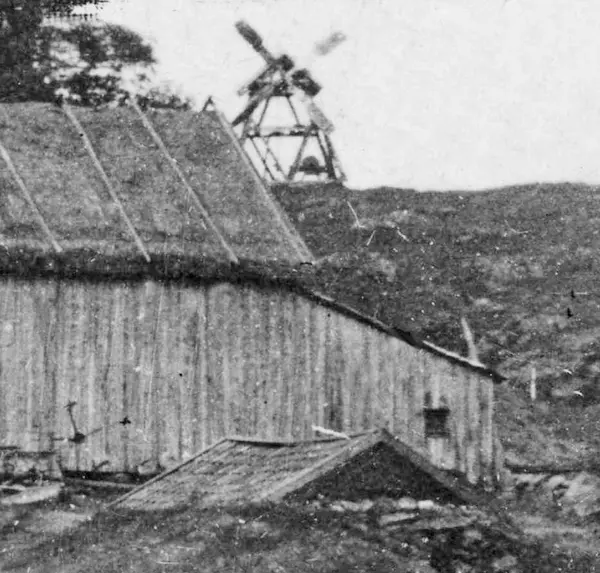 Delförstoring av nedre delen av huvudfoto, detalj uppe till höger om ladugården, på berget: Erik Hanssons vindkraftsnurra/väderkvarn på Näsberget som användes för att slipa liar och yxor med mera.