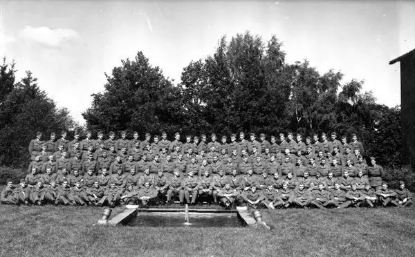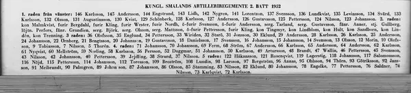 Furir Bergdahl, Kling, Wester, Nordh, överfurir Svensson (Kosing), Andersson, sergeant Tarland, Gustavsson, fänrik Anner, styckjunkare Gullberg, löjtnant Perfors, fänrik Grandien, sergeant Björk, Olsson, Mattsson, överfurir Pettersson. Inramad foto finns.- FotografOkänd