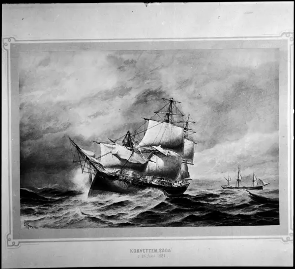 Motivet visar korvetten Saga till sjöss i hårt väder. Den förliga masten är avbruten något ovanför salningen och toppmasten hänger i tamparna ut över babords bog. I bakgrunden syns...